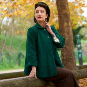 Indulge in vintage elegance with our Swing Jacket, a recreation of an original 1940s treasure in our archive. With big turn-back cuffs, shoulder pads, and 3 big buttons at the top front.