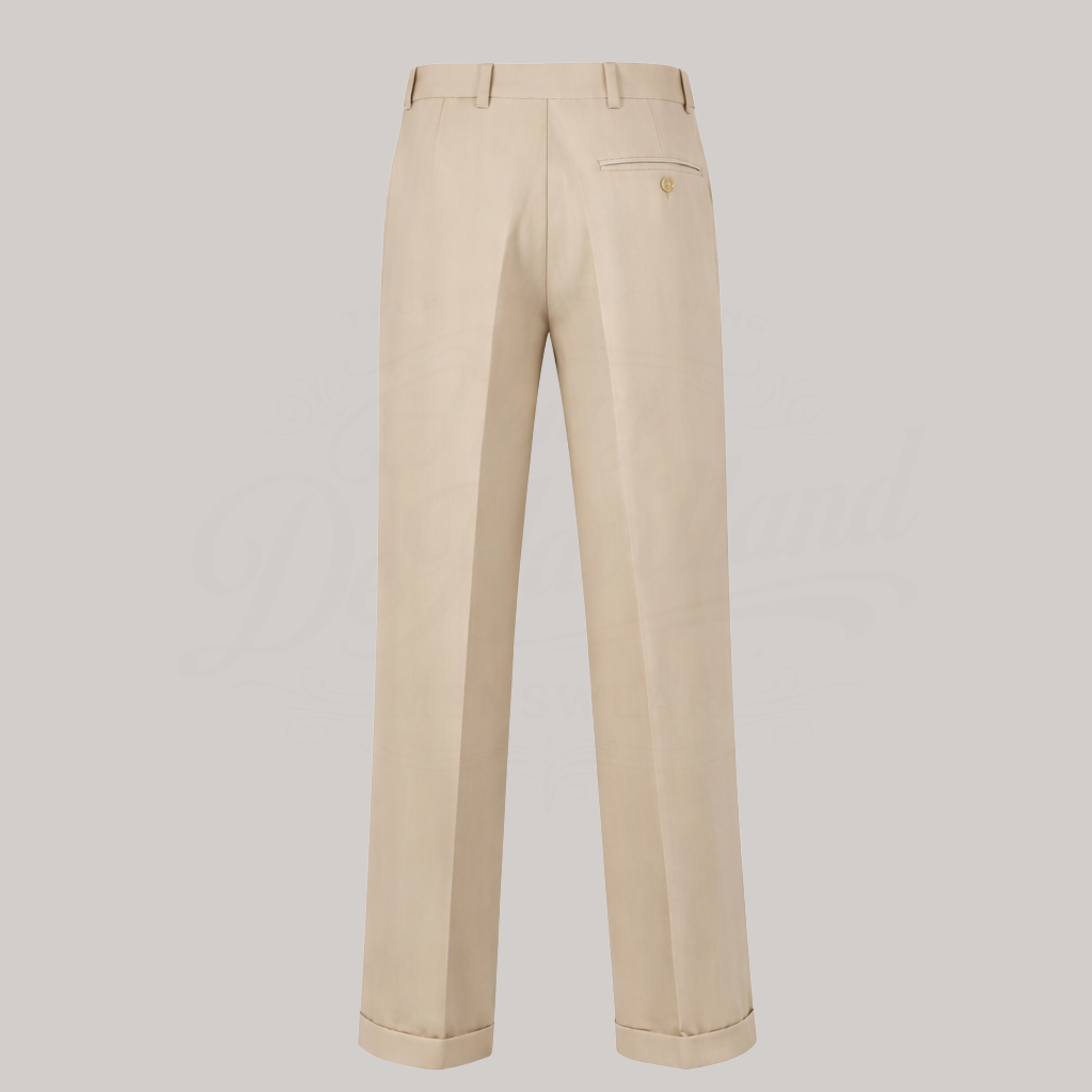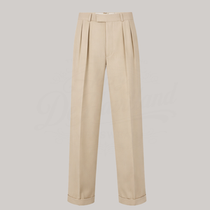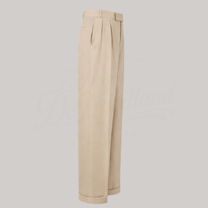 Authentic high-waisted wide-leg trousers with front pleats, crafted from high-quality tailoring fabric following the original 1945 pattern and 'Demob' specification. Featuring striped waistband lining and buttons for braces, these trousers include turn-ups, just as they were worn for the first time after WWII.