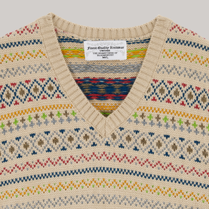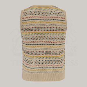 Our men's knitted slipover is a classic piece inspired by true mid-century style. It features our exclusive Bloomsbury Fair Isle pattern, designed especially for us, along with a smart V neckline and a sleeveless shape that works beautifully through the year. The carefully chosen tones make it easy to pair with any of our high-waist men's trousers from the 1940s or 1950s range for an authentic look.