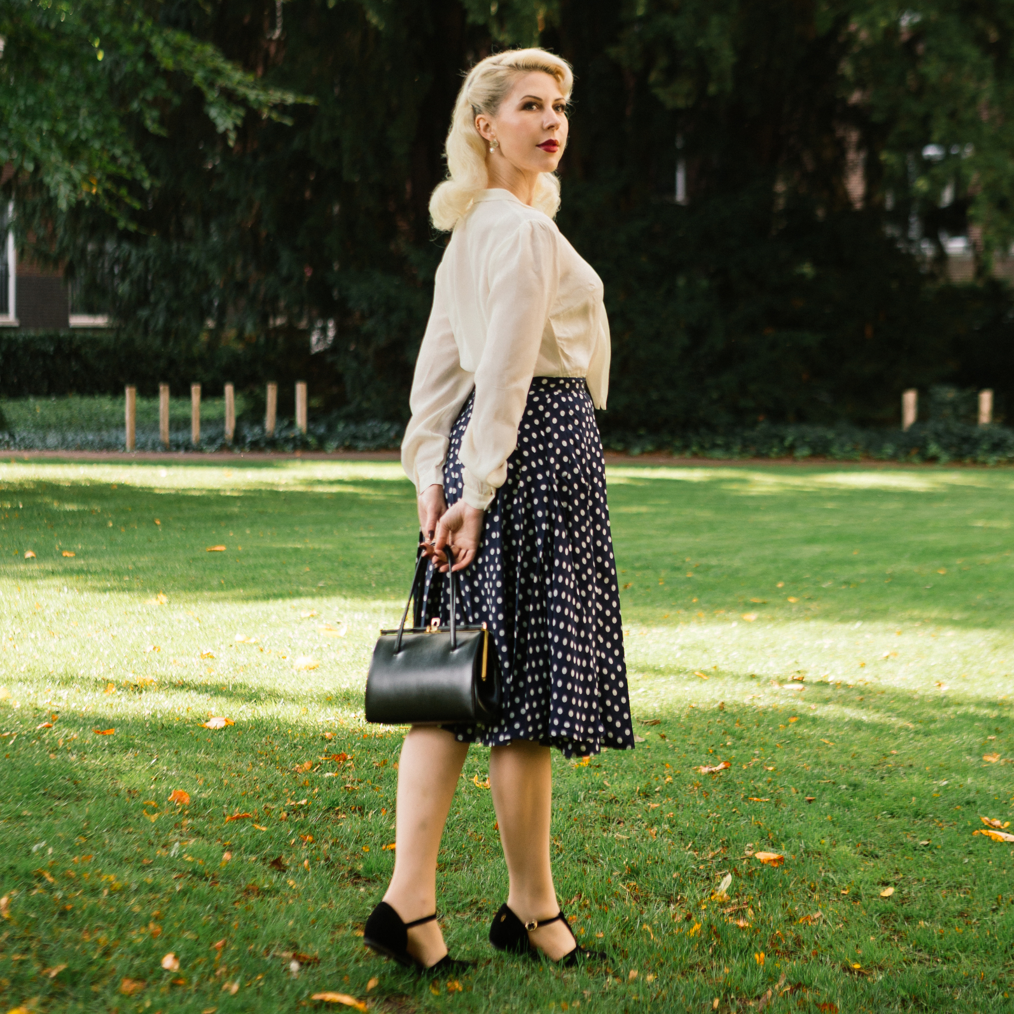 A fabulous vintage design, this skirt features meticulously pin-stitched inverted pleats, an invisible side zip and a large bakelite-style button on the waist.