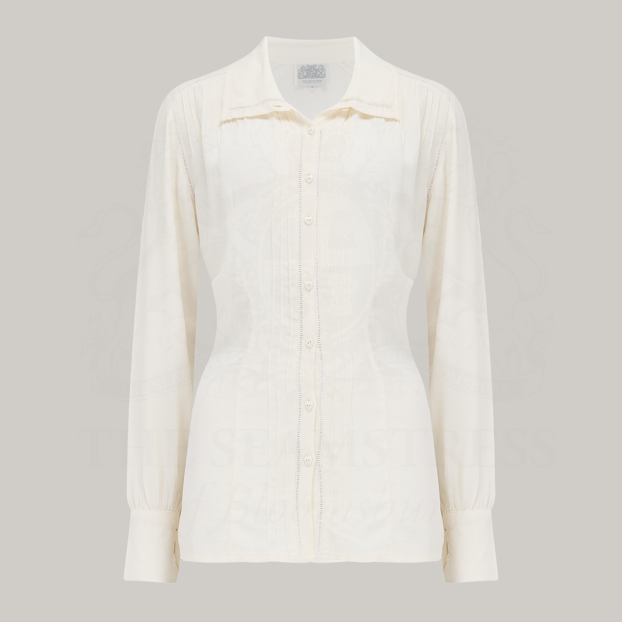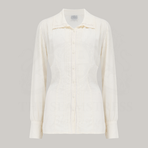 Crafted with utmost attention to detail and inspired by the timeless sophistication of the 1940s, this long-sleeved blouse is a stunning replica of a vintage piece from our esteemed collection. Carefully crafted with our luxurious Rayon Crepe de Chine fabric, it exudes authenticity and elegance.