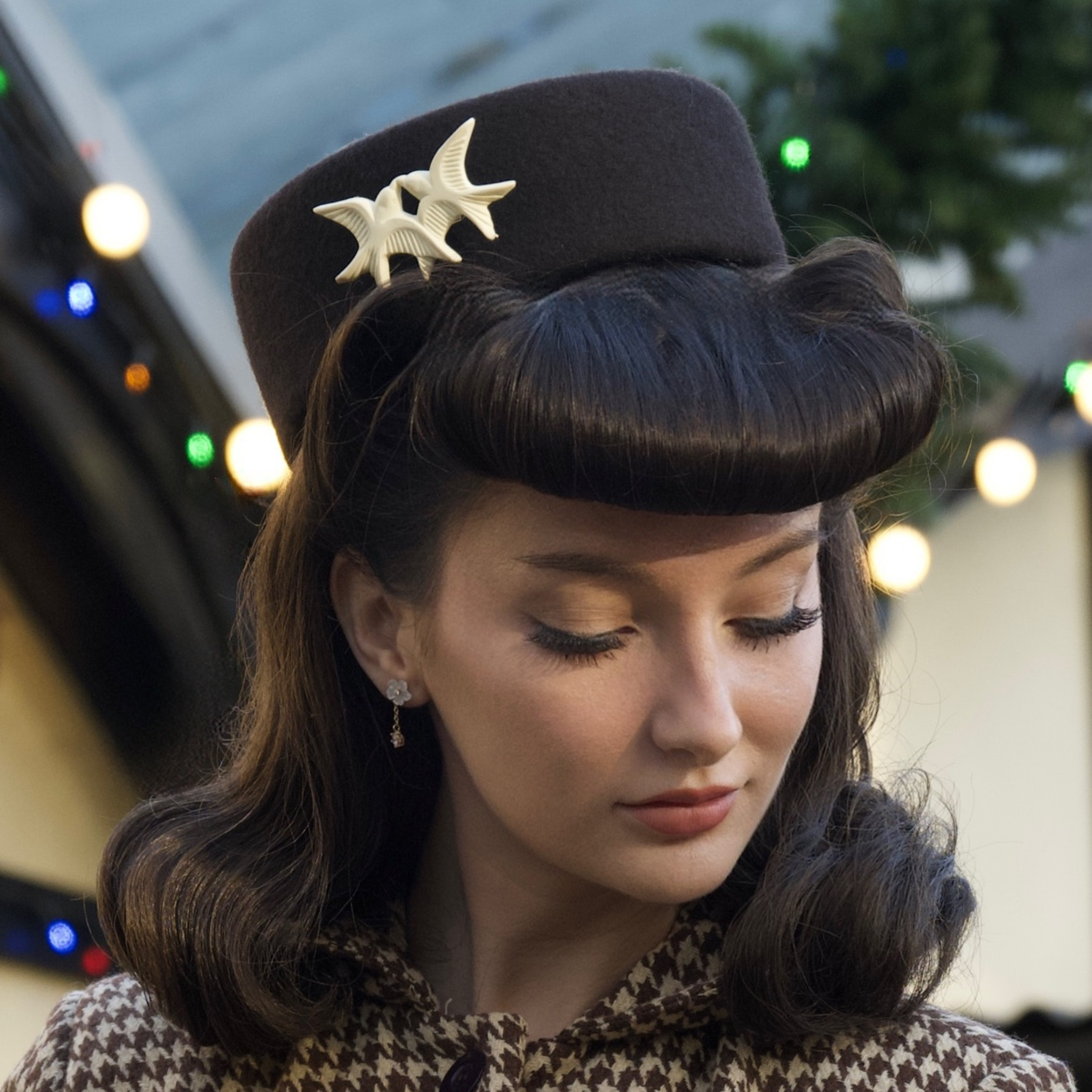 Enhance your look with our acrylic Bluebird brooch in cream, inspired by an original 1940s pin in our archive. This 4cm x 7.5cm accessory adds an authentic vintage touch to any outfit, making it the perfect finishing touch.