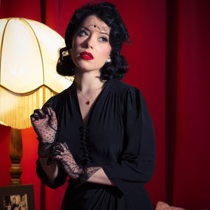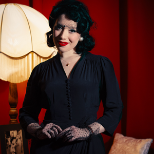 • For products made in our Rayon Crepe fabric we suggest you care for the garment in the same way you would for an original 40’s garment. We recommend you hand wash the garment just as they did back in the 1940’s, although nowadays you can dry clean them instead if you wish! Best not to dry them in direct sunlight or in an excessively hot place, as this can cause the natural yarn to twist and subsequently shrink. If you find you have washed or dried the garment too hot by accident, you can try the following method to regain the original size and fit. Although this isn’t guaranteed to work, it may help! 1. Please soak the garment in cold water with a very generous helping of fabric conditioner and leave overnight. 2. Then, rinse the garment in fresh cold water and as you gently squeeze out the excess water, stretch the garment in both width and length as far as you can. 3. Lay the garment flat on a towel to start drying slowly; but iron while it is still damp, again stretching in both directions. For our Atomic Satin print we recommend dry cleaning only.
