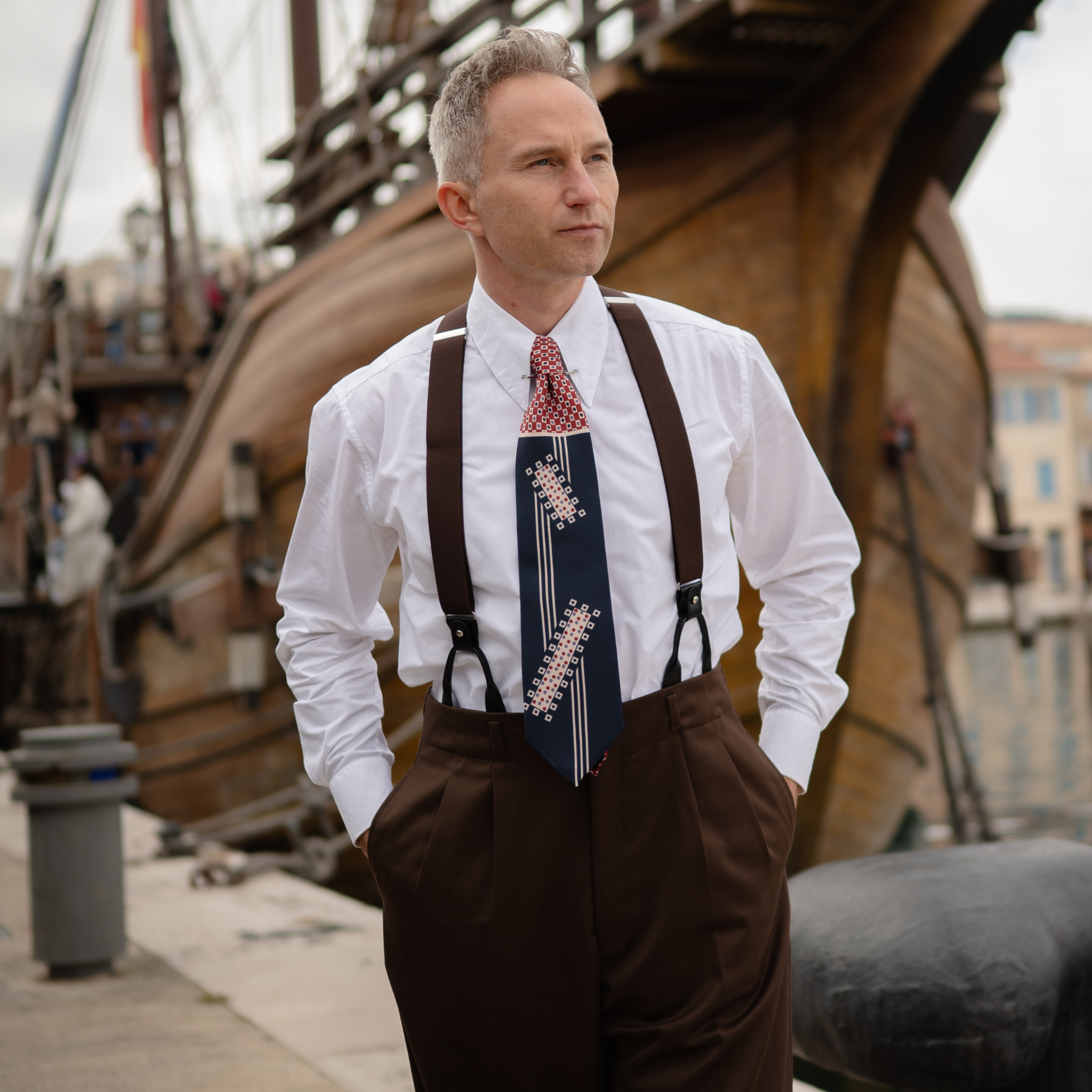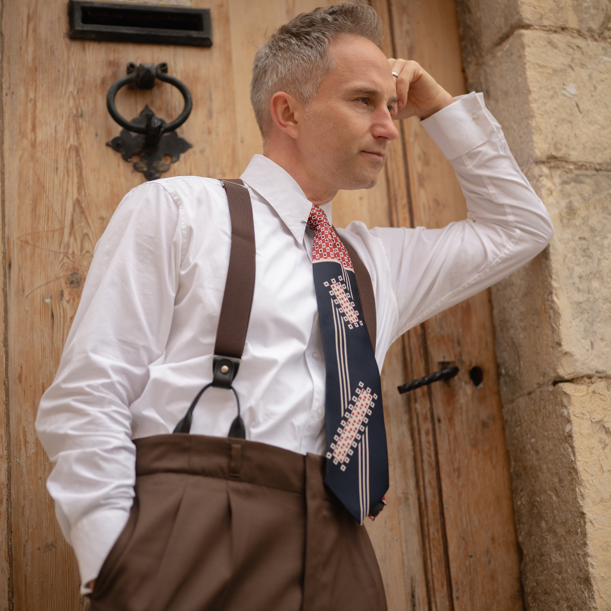Featuring a sharp spearpoint collar and traditional double French cuffs, this shirt brings a refined period feel to any gentleman’s wardrobe. Each piece is finished with a complementary pair of silk knit cufflinks, adding a considered and polished final detail.
