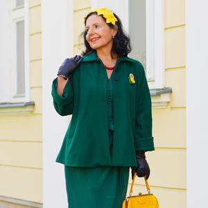 Indulge in vintage elegance with our Swing Jacket, a recreation of an original 1940s treasure in our archive. With big turn-back cuffs, shoulder pads, and 3 big buttons at the top front.
